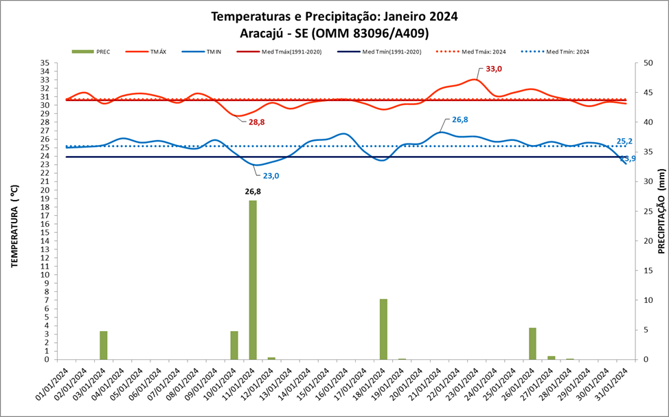 Figura 1: Temperaturas e precipitação (chuva) do mês de janeiro de 2024 em Aracajú (SE), média climatológica (1991-2020).