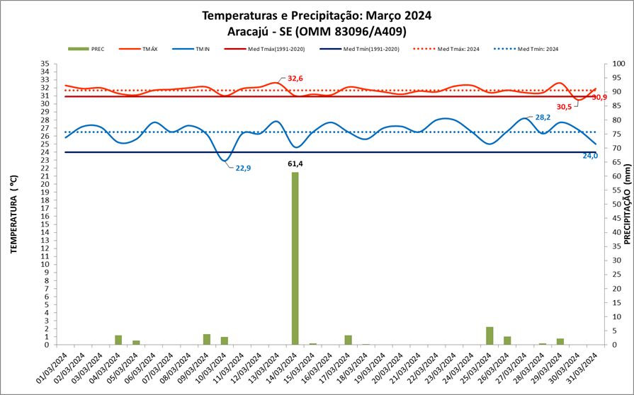 Figura 1: Temperaturas e precipitação (chuva) de março de 2024 em Aracajú (SE), Média Climatológica (1991-2020).
