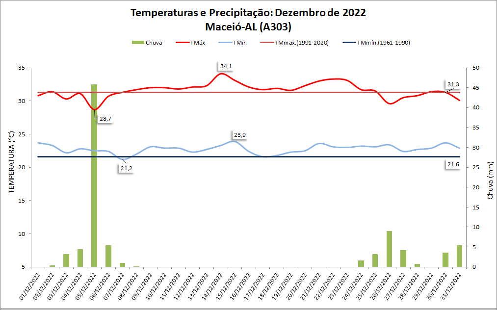 Além disso, a média da temperatura mínima foi de 22,8°C, ou seja, 1,2°C acima da Normal Climatológica da estação convencional (1961-1990), sendo de 21,6°C; essa temperatura é a 5ª maior para dezembro desde 2003 (igualmente a 2010 e 2017), ficando abaixo de 2021 e 2016 (23,3°C), 2009 (23,1°C), 2015 (23,0°C), 2019 e 2020 (22,9°C). Ainda nesse mês, a menor temperatura mínima foi de 21,2°C, registrada no dia 7, enquanto a maior mínima foi de 23,9°C, no dia 15.