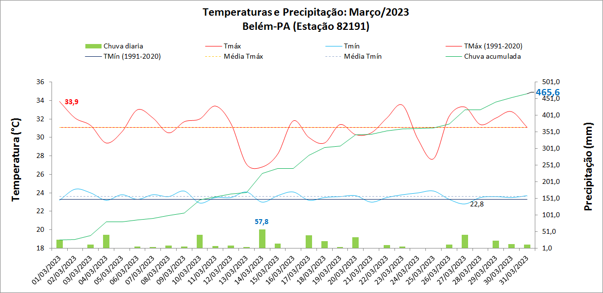 Figura 1: temperaturas e precipitação diárias em março de 2023 para Belém (PA). Referência: Normal Climatológica Inmet (1991 a 2020).