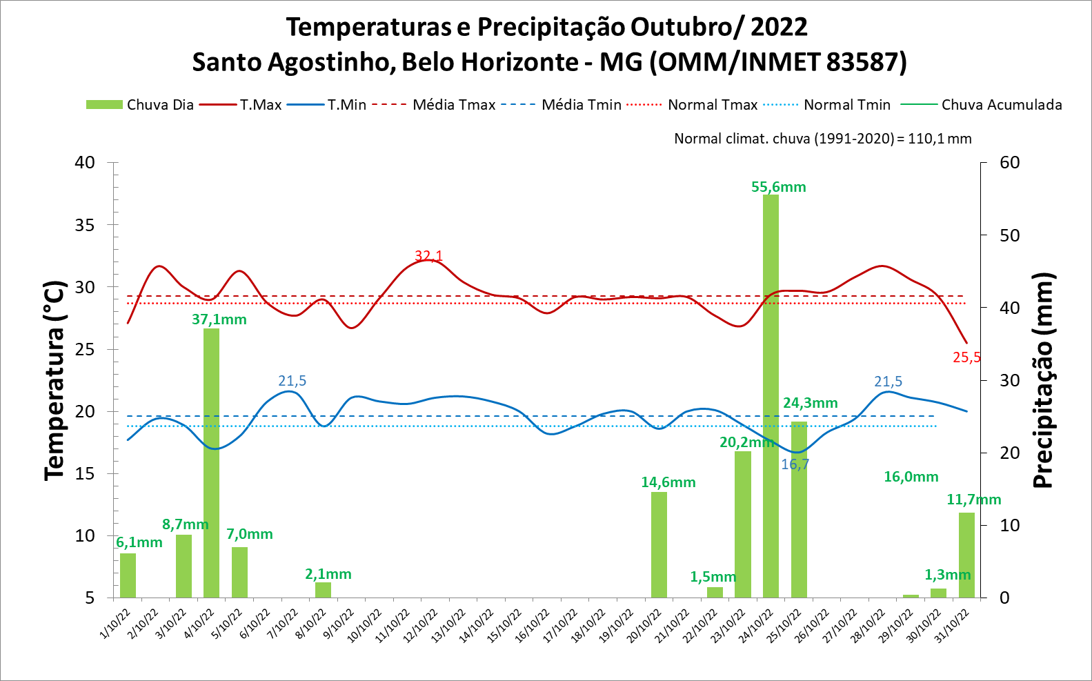 No mês de outubro, o total de chuva na estação meteorológica convencional do INMET em Belo Horizonte – MG foi de 190,6 mm, o que corresponde a 73% acima da média climatológica mensal (1991-2020) que é de 110,1 mm (Figura 1). Foram contabilizados 12 dias com chuva diária igual ou acima de 1 mm. O maior total diário de chuva foi 55,6 mm, registrado no dia 24/10. Houve um intervalo de 11 dias (do dia 9 ao dia 19) sem chuva, ocasião na qual foram observados índices de umidade mínima inferior a 30%.