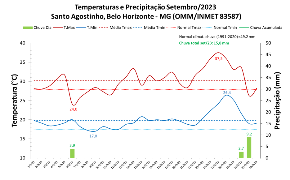 Setembro foi um mês de chuvas escassas em Belo Horizonte (MG). Ao todo, foram registrados apenas 3 dias com chuva igual ou acima de 1,0 milímetro (mm). No mês, o total acumulado foi de 15,8 mm. Esse valor correspondente a apenas 32% da média histórica mensal, que é de 49,2 mm.