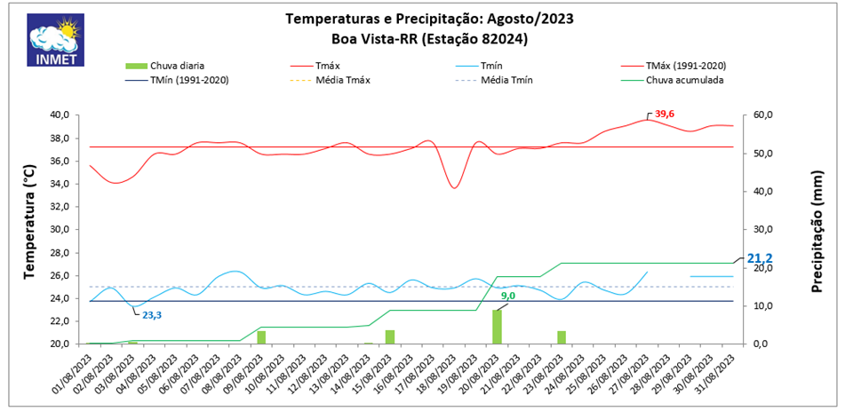 Em agosto, o total de chuva na estação meteorológica convencional de Boa Vista (RR) foi de 21,2 milímetros (mm). Esse valor corresponde a 9,6% da média climatológica (1991 a 2020), que é de 220,7 mm. O valor é o segundo menor total de chuva para o mês de agosto em 63 anos.