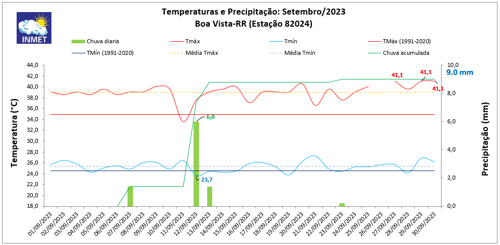 Em setembro de 2023, Boa Vista (RR) registrou 9,0 milímetros (mm) de chuva na estação meteorológica convencional do Instituto Nacional de Meteorologia (Inmet), localizada na capital. O valor equivale a apenas 9,2% da Normal Climatológica de 1991 a 2020 (média histórica), que é de 98,1 mm.