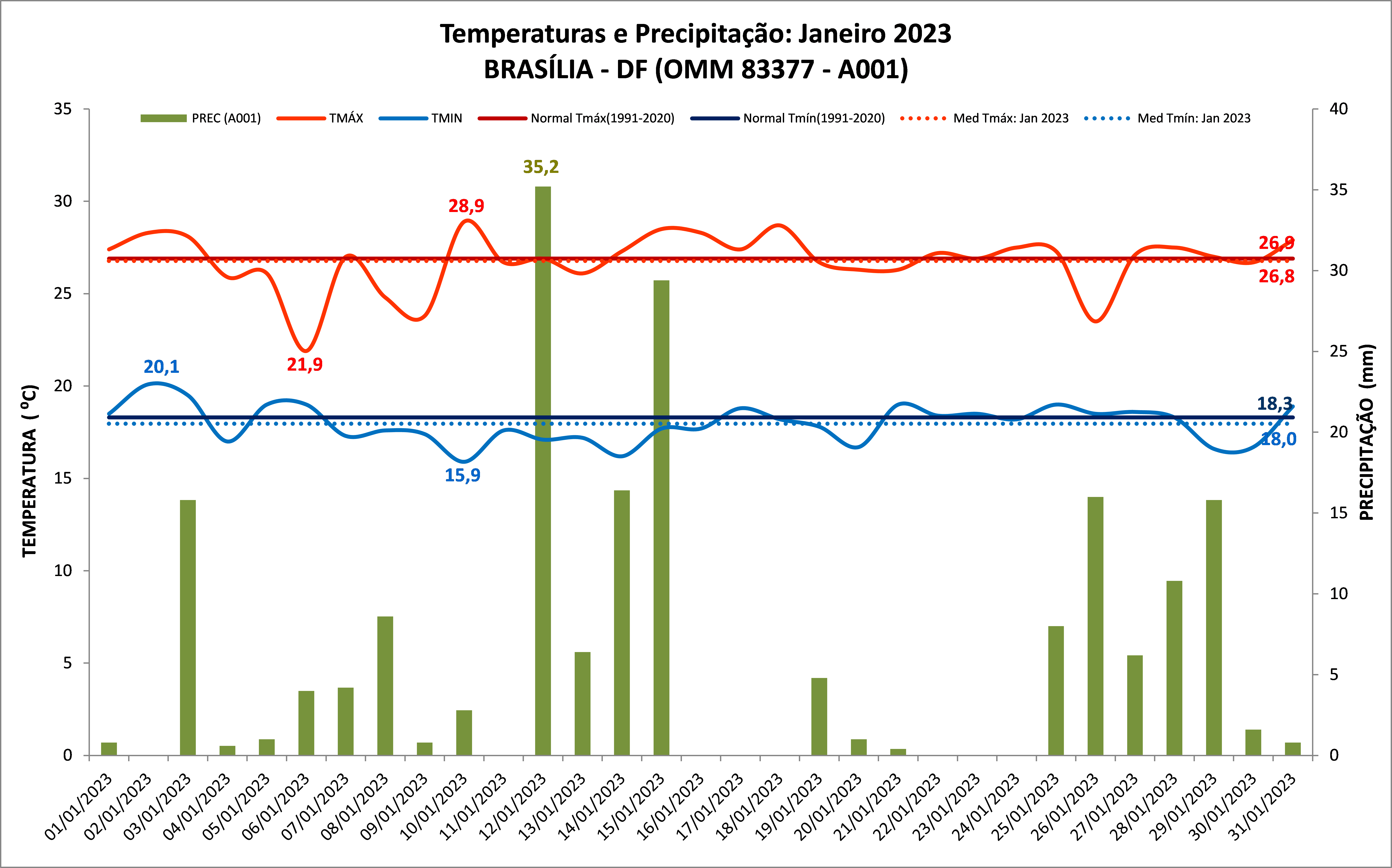 Figura 1: Temperaturas e chuva de janeiro de 2023 em Brasília (DF) e Normal Climatológica (1991 a 2020).