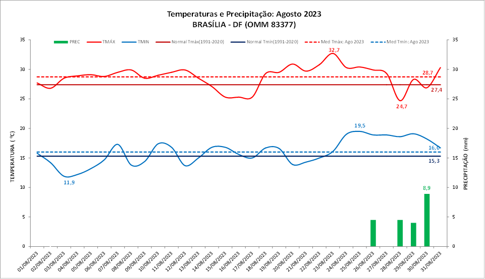 Figura 1: Temperaturas e precipitação (chuva) do mês de agosto de 2023 em Brasília (DF) versus a Normal Climatológica (1991 a 2020).