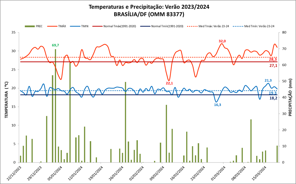 Figura 1: Temperaturas e precipitação (chuva) do verão 2023/2024 em Brasília (DF) e Normal Climatológica (1991 a 2020).