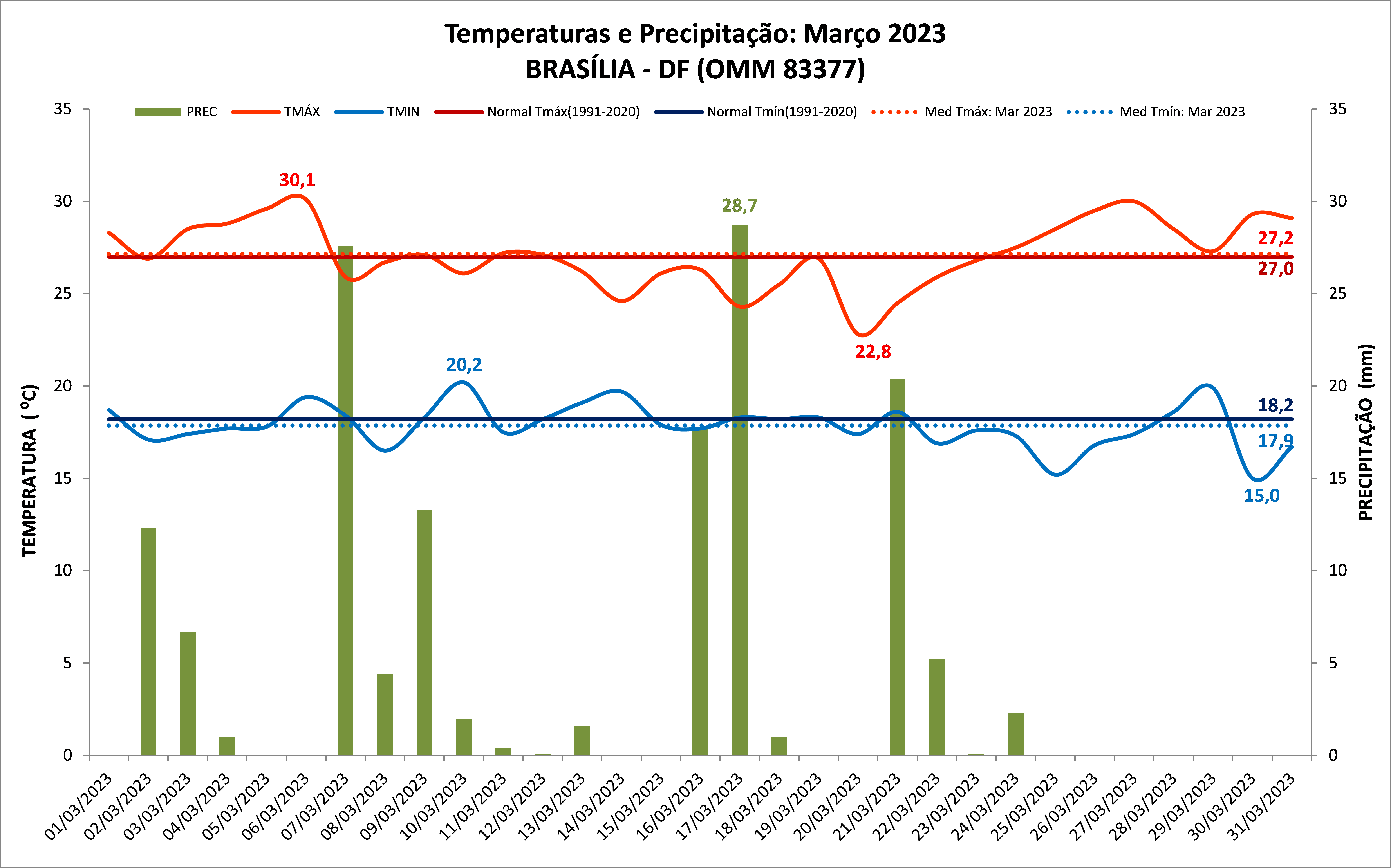 Figura 1: Gráfico das temperaturas e chuvas de março de 2023 em Brasília (DF) com a Normal Climatológica de 1991/2020 (média histórica).