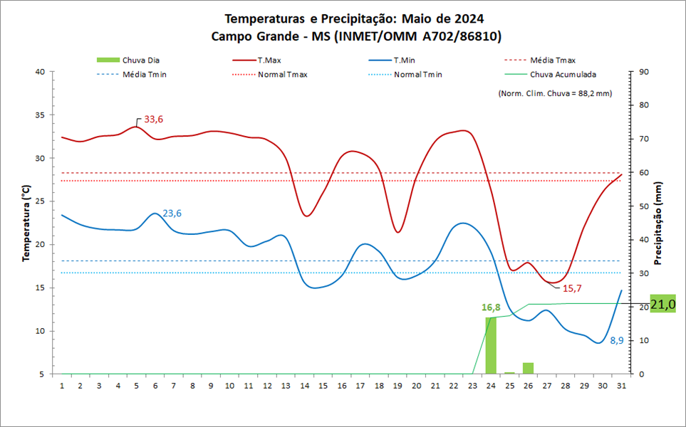 Em Campo Grande (MS), a precipitação (chuva) acumulada em maio, na estação automática do Inmet, foi de 21,0 milímetros (mm), o que representa um desvio de 67,2 mm (76 %) abaixo da Normal Climatológica (1981 a 2010), que é de 88,2 mm.