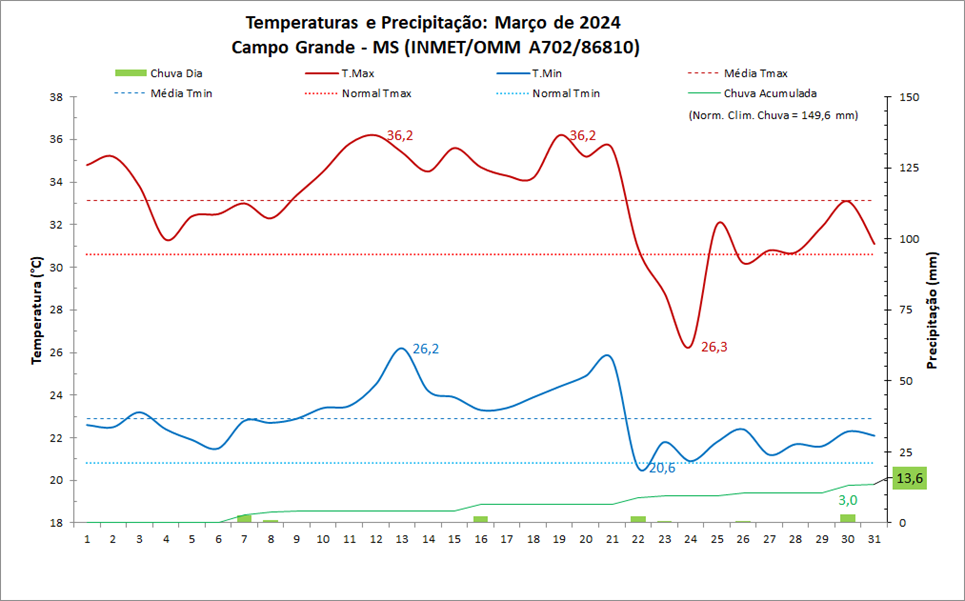 Figura 1: temperaturas e precipitação (chuva) diárias em março de 2024 para Campo Grande (MS). Referência: Normal Climatológica (1981 a 2010).