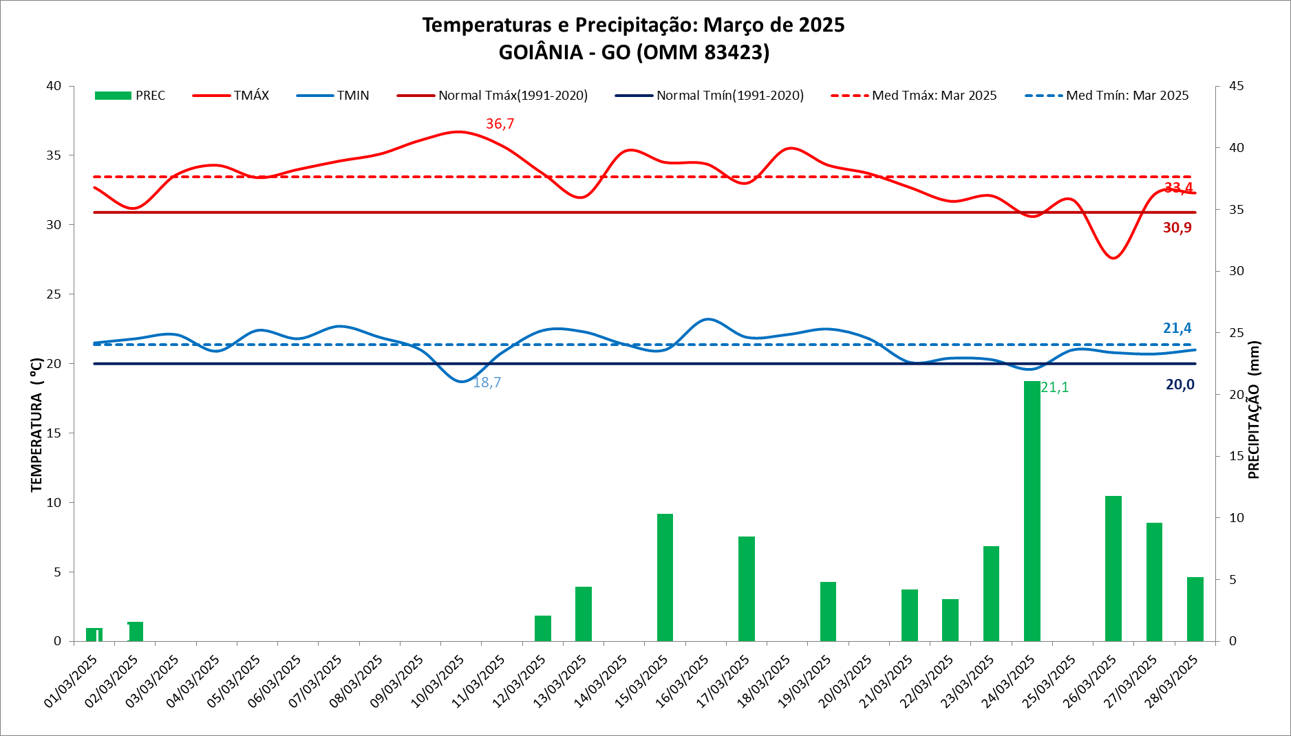 Figura 1: Temperaturas e precipitação do mês de março de 2025 em Goiânia – GO versus a Normal Climatológica (1991 a 2020)