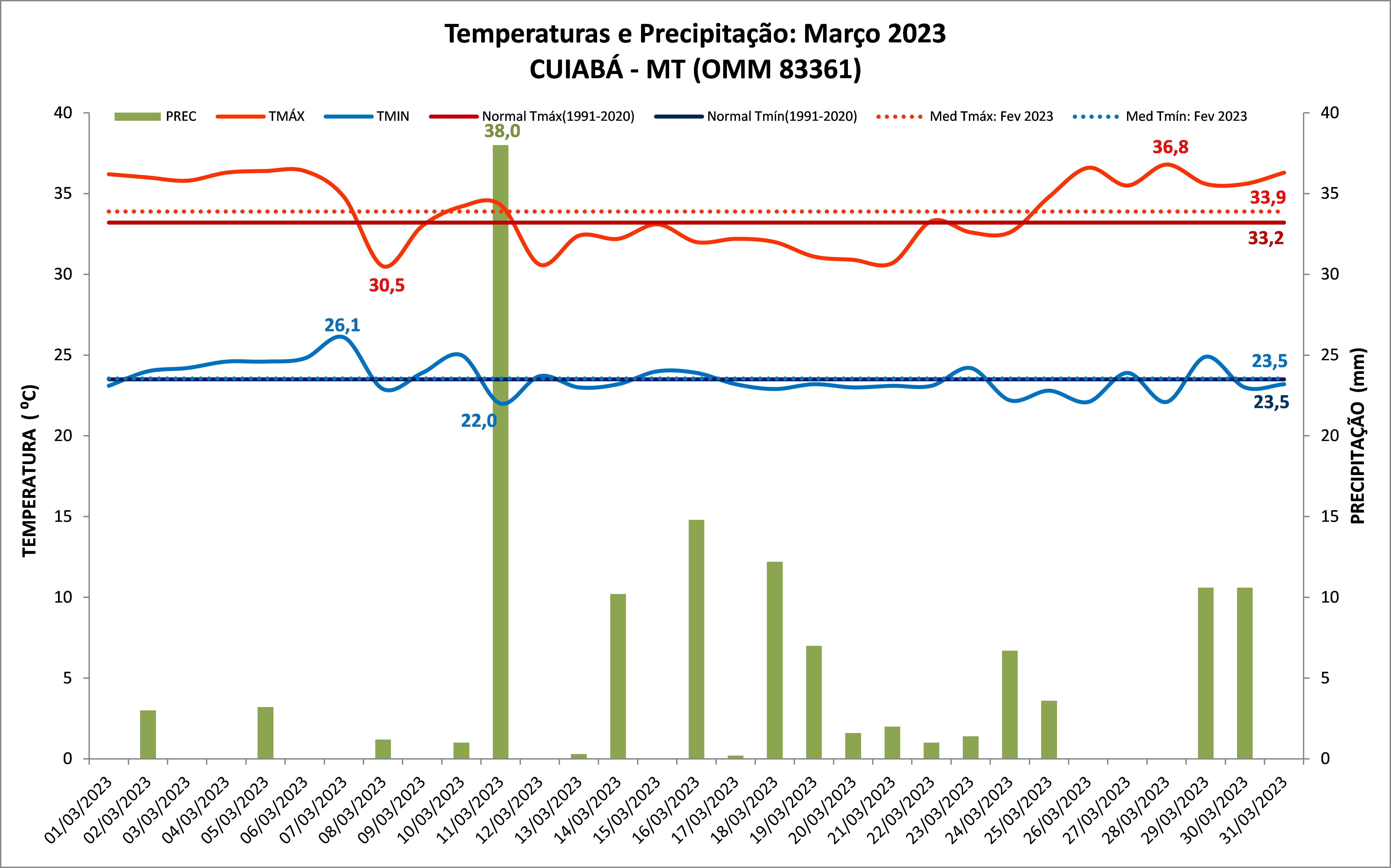 Figura 1: Temperaturas e chuvas de março de 2023 em Cuiabá (MT) com a Normal Climatológica de 1991/2020.