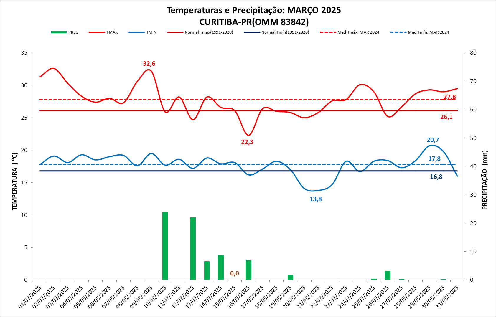 Figura 1: Temperaturas e precipitação do mês de março de 2025 em Curitiba – PR e Normal Climatológica (1991 a 2020)