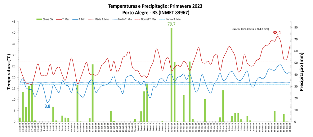 A média das temperaturas máximas ficou em 26,0°C, valor abaixo da média sazonal (1991-2020) da primavera, que é de 26,9°C. Essa foi a menor temperatura média, desde 2015, quando registrou 25,5°C. A maior temperatura desta primavera medida na estação convencional ocorreu no dia 17 de dezembro, com 38,4°C.