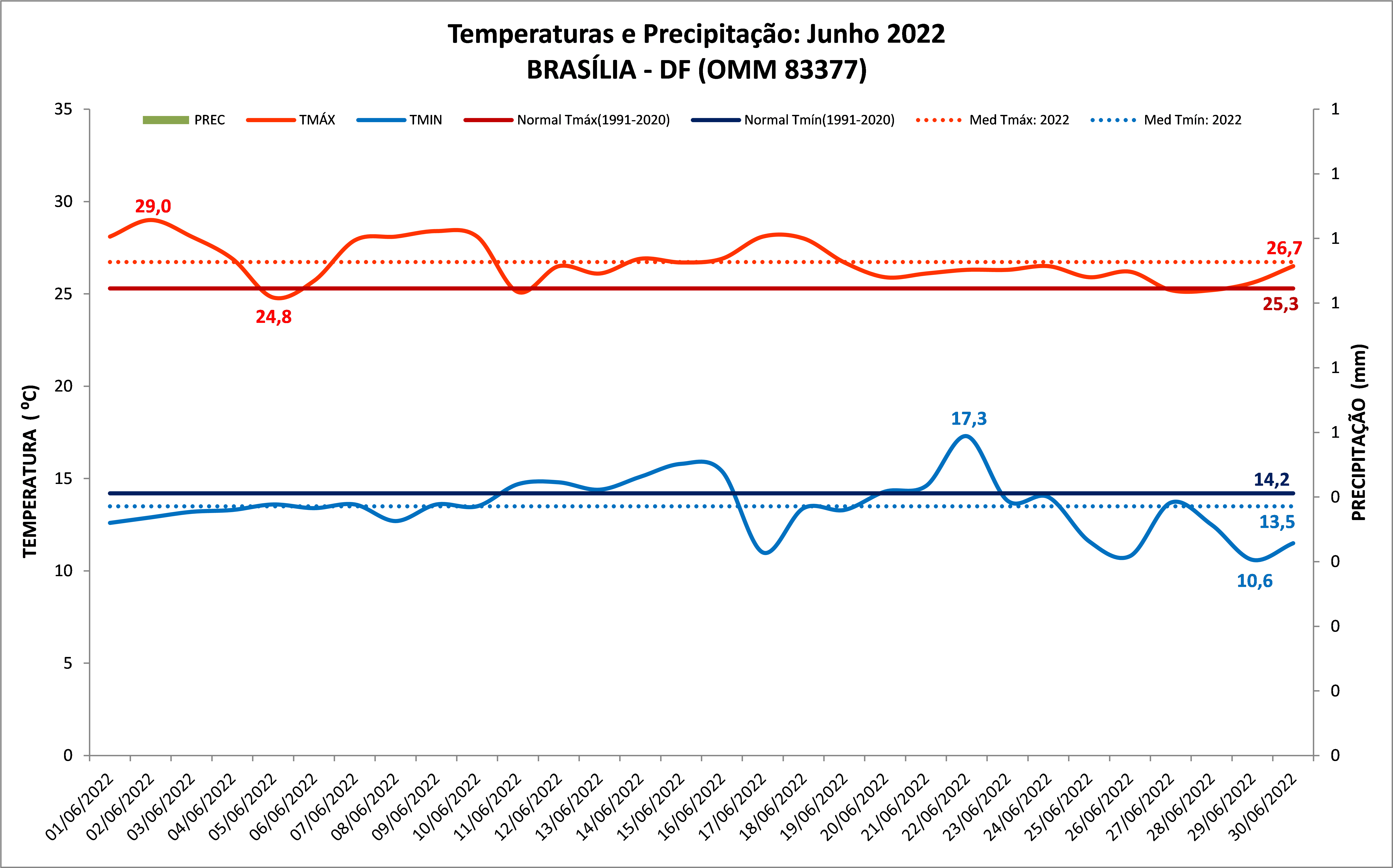 Figura 1: Temperaturas e precipitação do mês de junho de 2022 em Brasília – DF e Normal Climatológica (1991 a 2020).