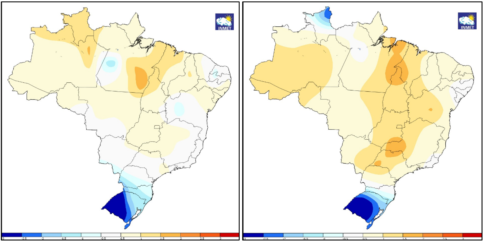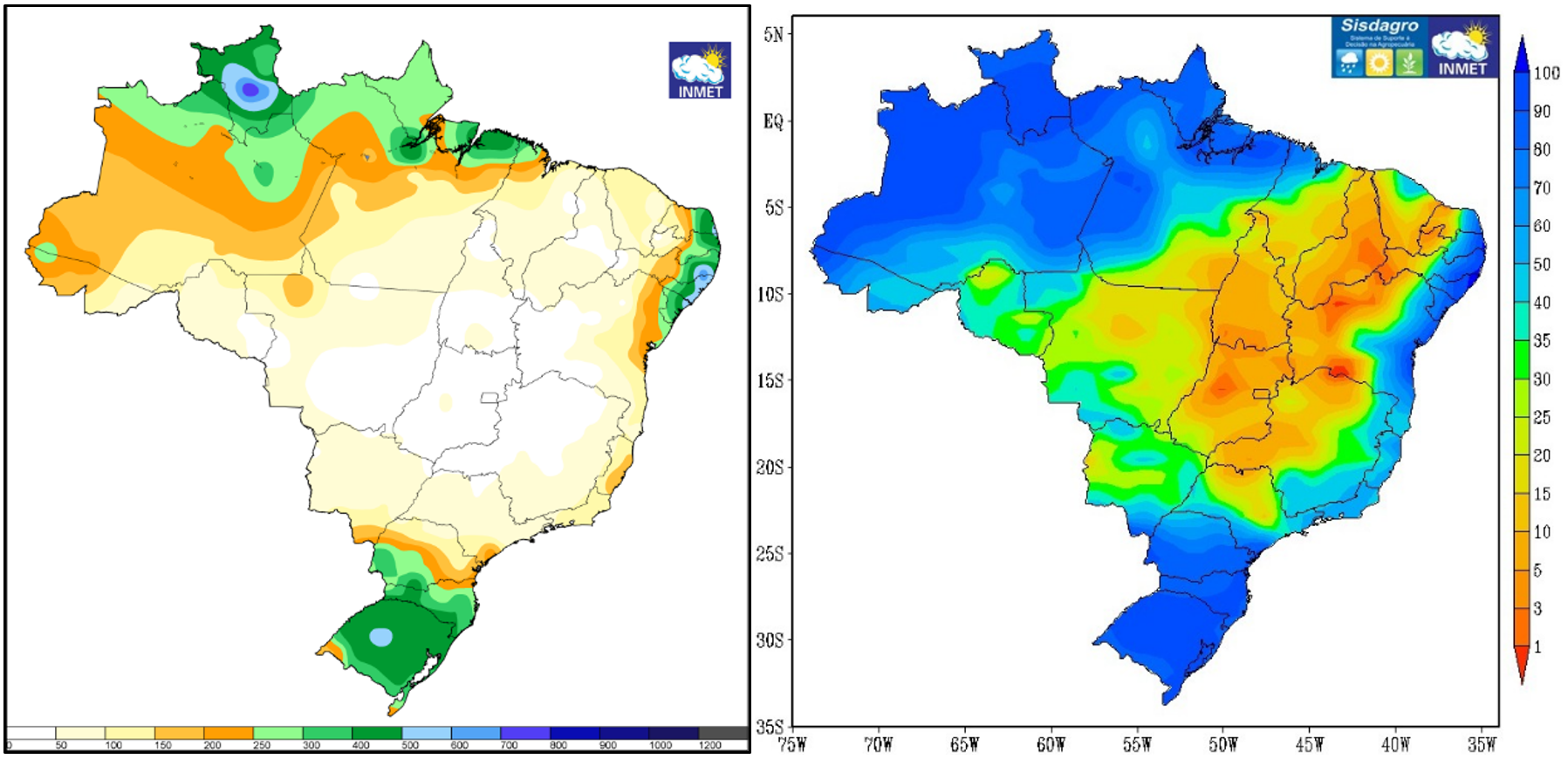 Em contrapartida, o interior do Nordeste, grande parte do Centro-Oeste e do Sudeste apresentaram volumes inferiores a 200 mm (tons em laranja e amarelo – Figura 1a), refletindo em níveis críticos de armazenamento hídrico no solo (abaixo de 15%), especialmente no nordeste do Mato Grosso, Goiás, oeste de Minas Gerais, noroeste de São Paulo, Tocantins, Maranhão, Piauí, Ceará, bem como o oeste dos estados do Rio Grande do Norte, Paraíba, Pernambuco e Bahia (tons em laranja na Figura 1b). Níveis intermediários de umidade do solo, foram observados em parte de Rondônia, Mato Grosso e Mato Grosso do Sul. Ressalta-se que durante o inverno, é comum ocorrer a redução das chuvas.