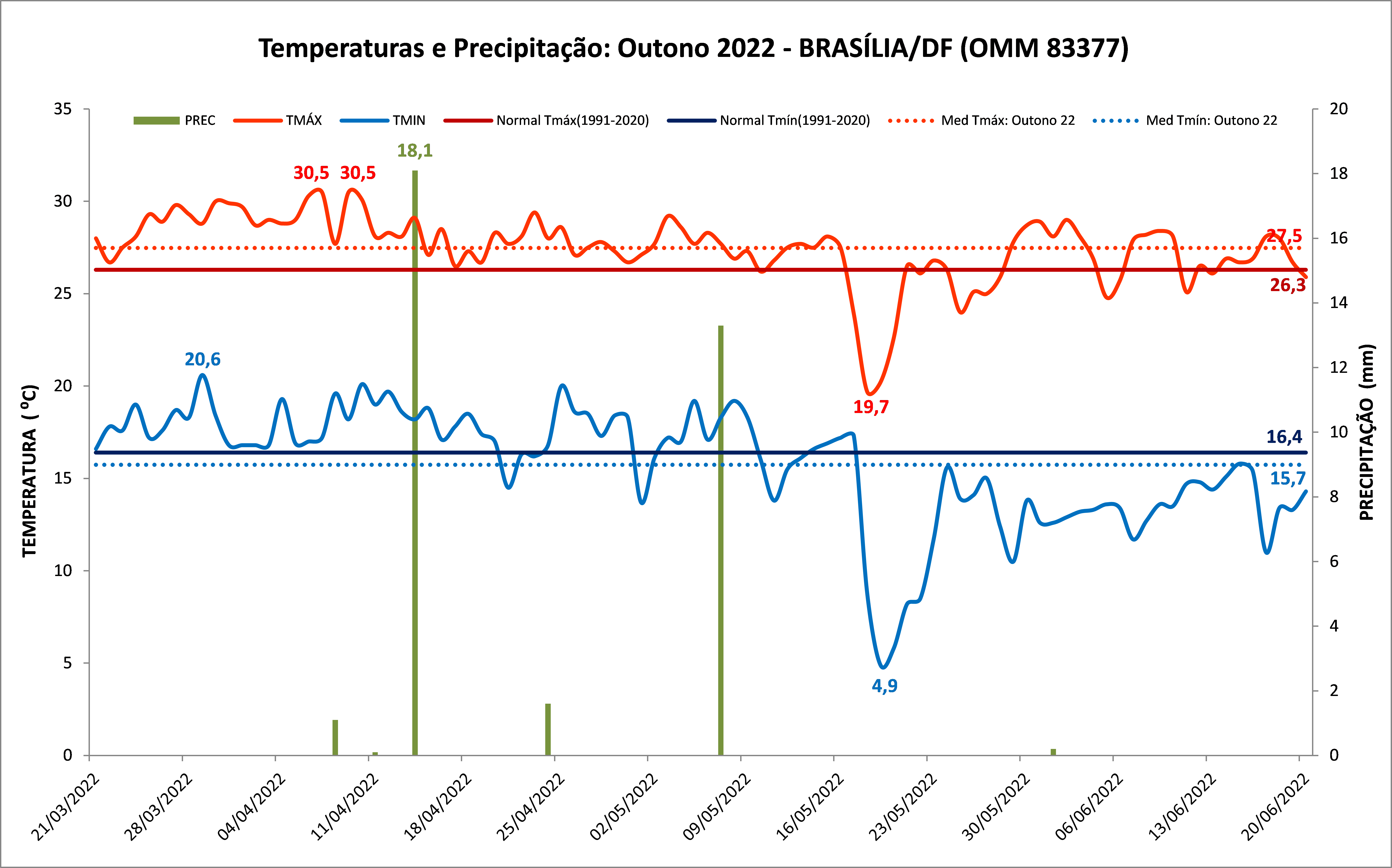 Figura 1: Temperaturas e precipitação do Outono de 2022 em Brasília – DF e Normal Climatológica (1991 a 2020).