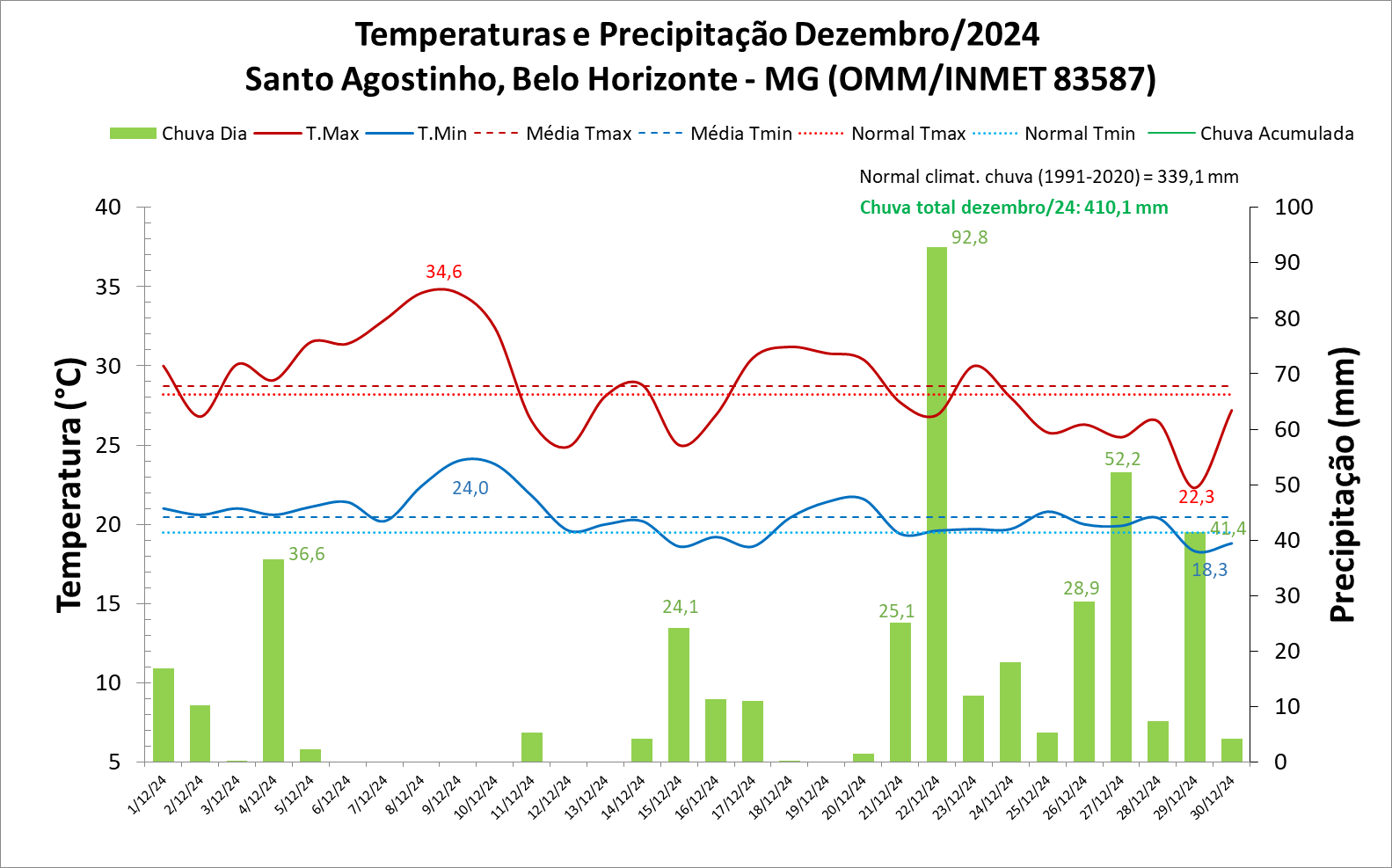 Dezembro iniciou com chuvas escassas em Belo Horizonte, mas a partir do dia 15 se tornaram recorrentes, principalmente a partir do dia 21. O total acumulado mensal foi de 410,1 mm valor aproximadamente 21% acima da climatologia mensal que é de 339,1 mm.