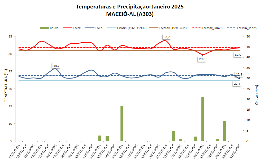 No mês de janeiro, o total de chuva na estação meteorológica automática do INMET em Maceió-AL (A303) foi de 62,2 mm, o que corresponde a aproximadamente 32% abaixo da normal climatológica (1991-2020) que é de 91,2 mm (Figura 1). O número de dias com chuva no mês acima de 1,0 mm foi de 8. O maior total diário de chuva do mês ocorreu no dia 26/01 (21,2 mm).