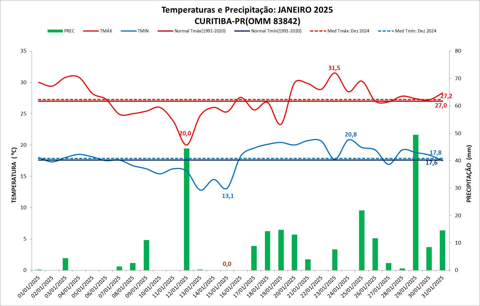Em janeiro de 2025, houve 17 dias com registro de precipitação na estação automática de Curitiba (A807), totalizando 235,6 milímetros (mm), o que equivale a 4,0% acima da Normal Climatológica (1991-2020), que é de 226,3 mm. Ou seja, um saldo em volume de 9,3 mm. O maior acumulado de chuva em 24 horas foi registrado no dia 12/01, com 49,4 mm.