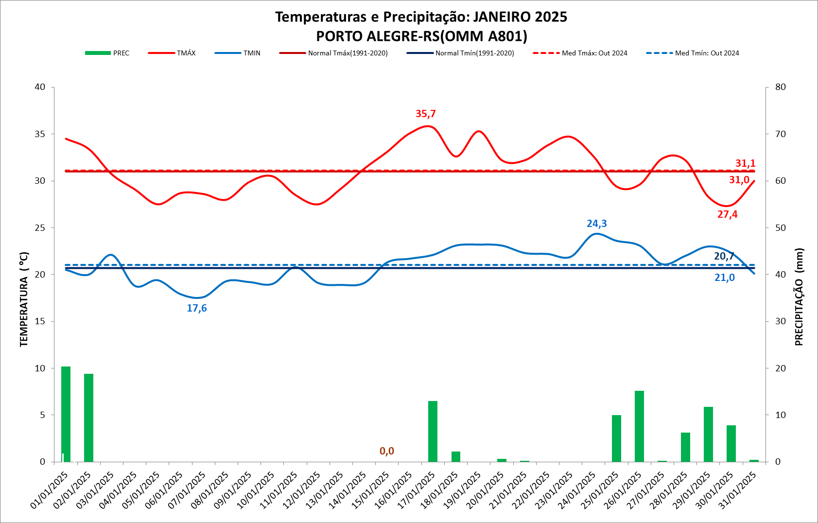 Figura 1: Temperaturas e precipitação do mês de janeiro de 2024 em Porto Alegre – RS e Normal Climatológica (1991 a 2020)