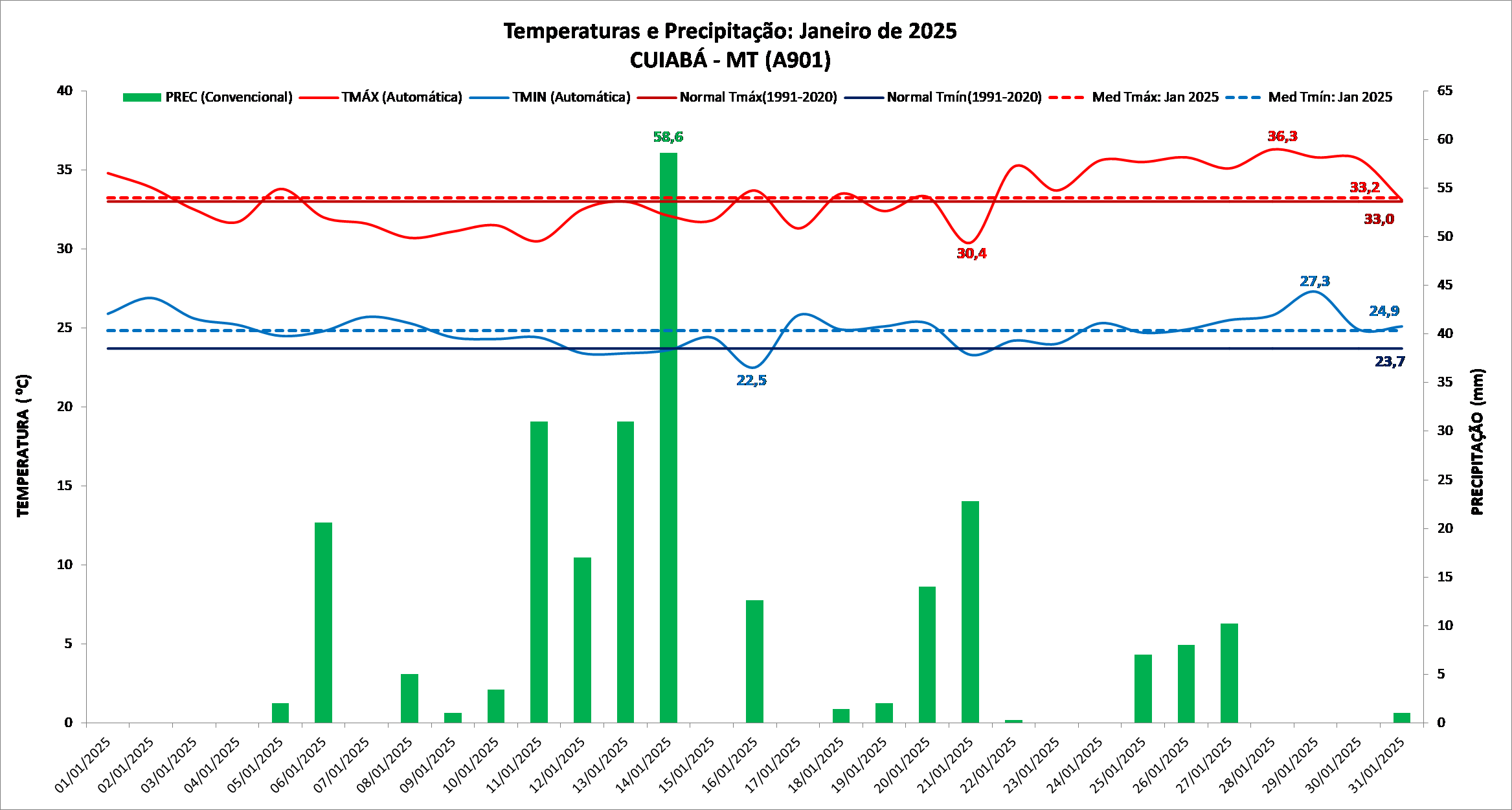 Figura 1: Temperaturas e precipitação do mês de janeiro de 2025 em Cuiabá – MT versus a Normal Climatológica (1991 a 2020)