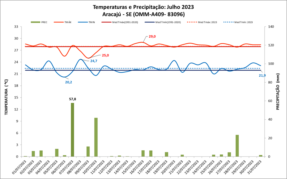 Figura 1: Temperaturas e precipitação (chuva) do mês de julho de 2023, em Aracajú (SE), Média Climatológica (1991-2020).
