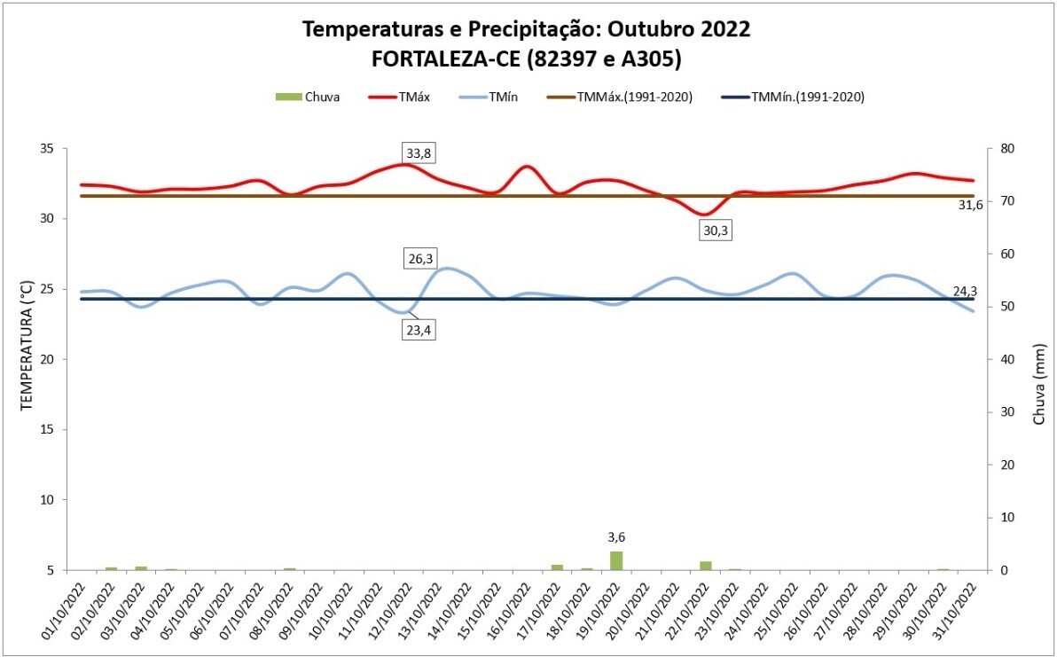 Já a temperatura máxima média da estação automática foi de 32,3°C (0,7°C acima da série climatológica da estação convencional, 31,6°C). Essa temperatura máxima média do mês de outubro de 2022 é a terceira maior (juntamente com 2017), desde 2003, ficando atrás somente dos 32,7°C em outubro de 2016 e 32,4°C em 2020. A maior temperatura máxima do mês foi de 33,8°C no dia 12/10, valor que corresponde à quarta maior temperatura máxima de outubro (igualmente com 03/10/2016) e não ultrapassando os valores 34,5°C em 25/10/2017, 34,1°C em 09/10/2014 e 22/10/2017, 33,9°C em 26/10/2017 e 04/10/2016. Por outro lado, a menor temperatura máxima diária do mês foi de 30,3°C no dia 22/10.