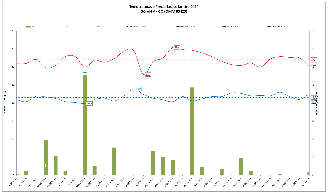 Figura 1: Gráfico referente as temperaturas e precipitação (chuva) de janeiro de 2024 em Goiânia (GO) x Normal Climatológica (1991-2020).