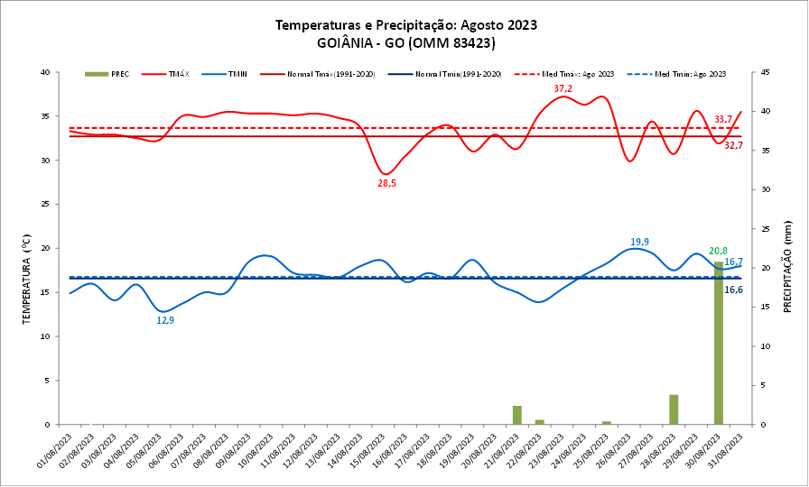 Figura 1: Temperaturas e precipitação (chuva) do mês de agosto de 2023 em Goiânia (GO) versus a Normal Climatológica (1991 a 2020).