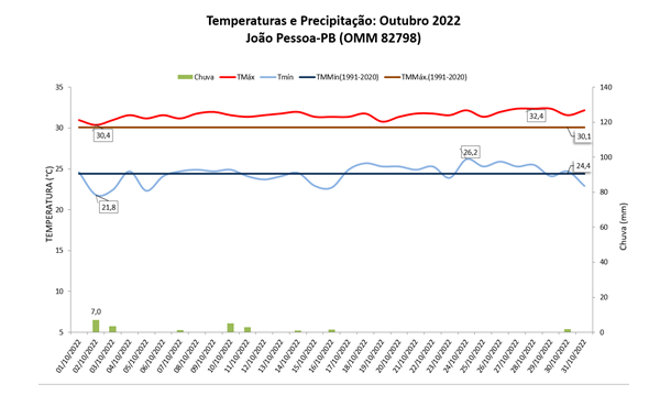 A temperatura máxima média na capital paraibana foi de 31,6°C, ou seja, 1,5°C acima da média histórica. O valor é o 2º maior para outubro desde 1961