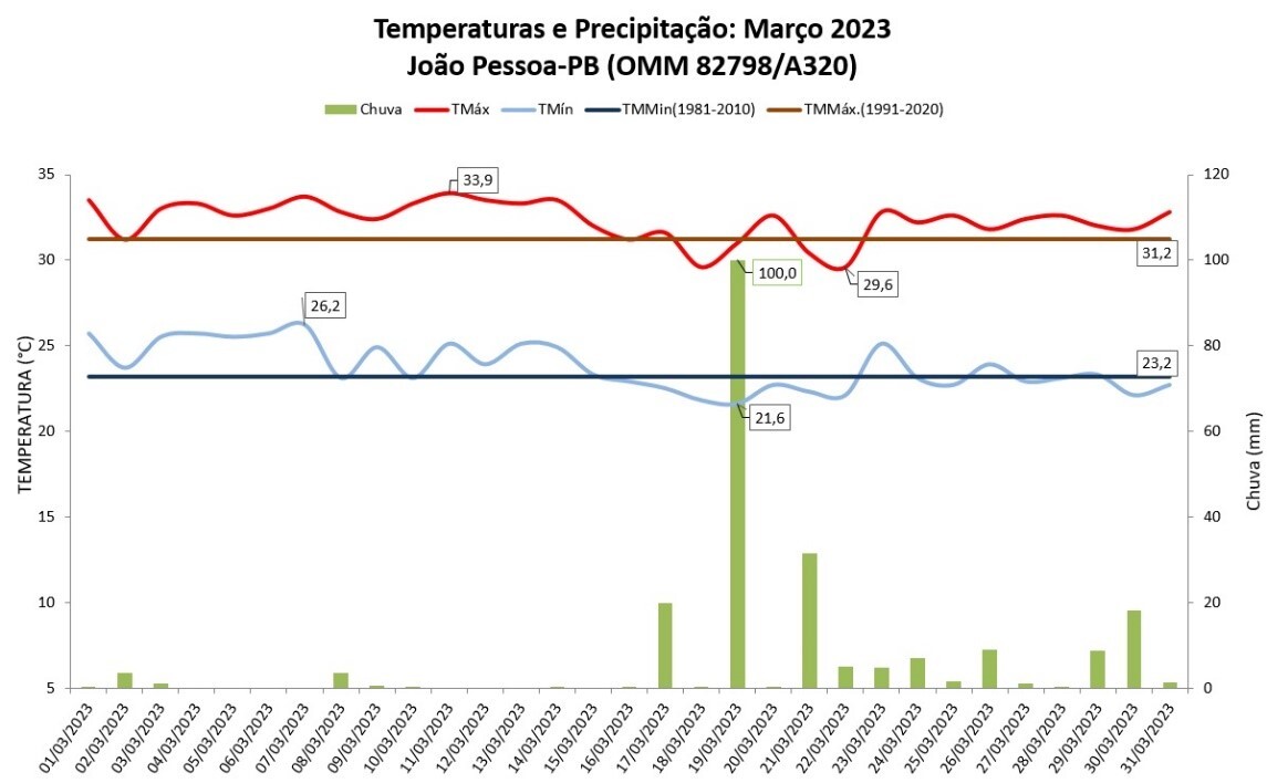 Ao todo, a capital paraibana teve 15 dias com chuva acima de 1,0 mm em março, sendo que o maior volume em 24h ocorreu no dia 19, com 100,0 mm. Esse valor é considerado o maior para o mês de março desde 2007, superando os 83,2 mm registrados no dia 30/03/2008.