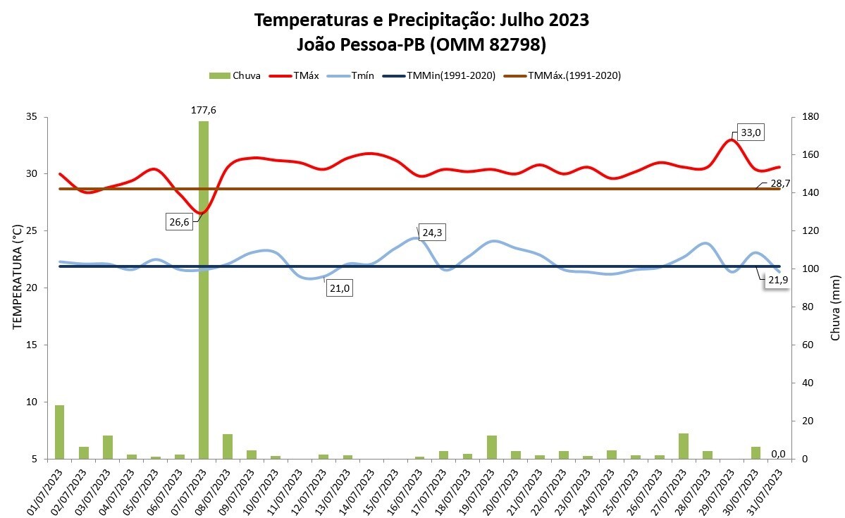 Balanço: João Pessoa (PB) teve chuva e temperaturas acima da média em julho/2023