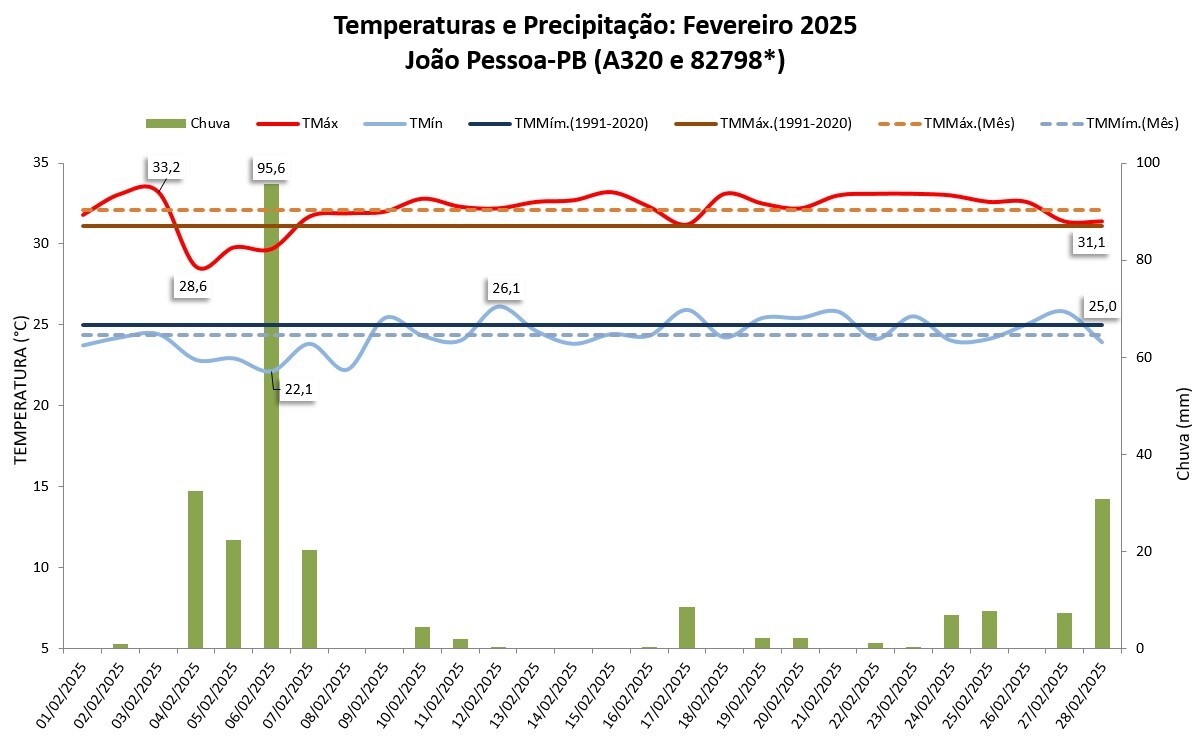 No mês de fevereiro, o total de chuva na estação meteorológica convencional do INMET em João Pessoa-PB (82798) foi de 244,0 mm, o que corresponde a aproximadamente 130% acima da normal climatológica (1991-2020) que é de 106,2 mm (Figura 1); este total mensal é o 6º maior para fevereiro desde 1961, ficando atrás dos seguintes anos: 2021 (329,7 mm), 1964 (306,0 mm), 2009 (260,1 mm), 2003 (252,9 mm) e 1976 (249,6 mm) O número de dias com chuva no mês (acima de 1,0 mm) foi de 14. O maior total diário de chuva do mês ocorreu no dia 06/02 (95,6 mm).