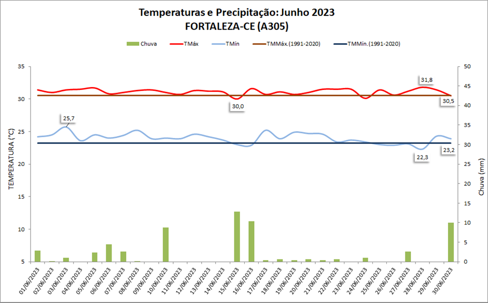 A maior temperatura máxima do mês foi de 31,8°C, no dia 28. A menor temperatura máxima foi de 30,0°C, em 15 de junho.