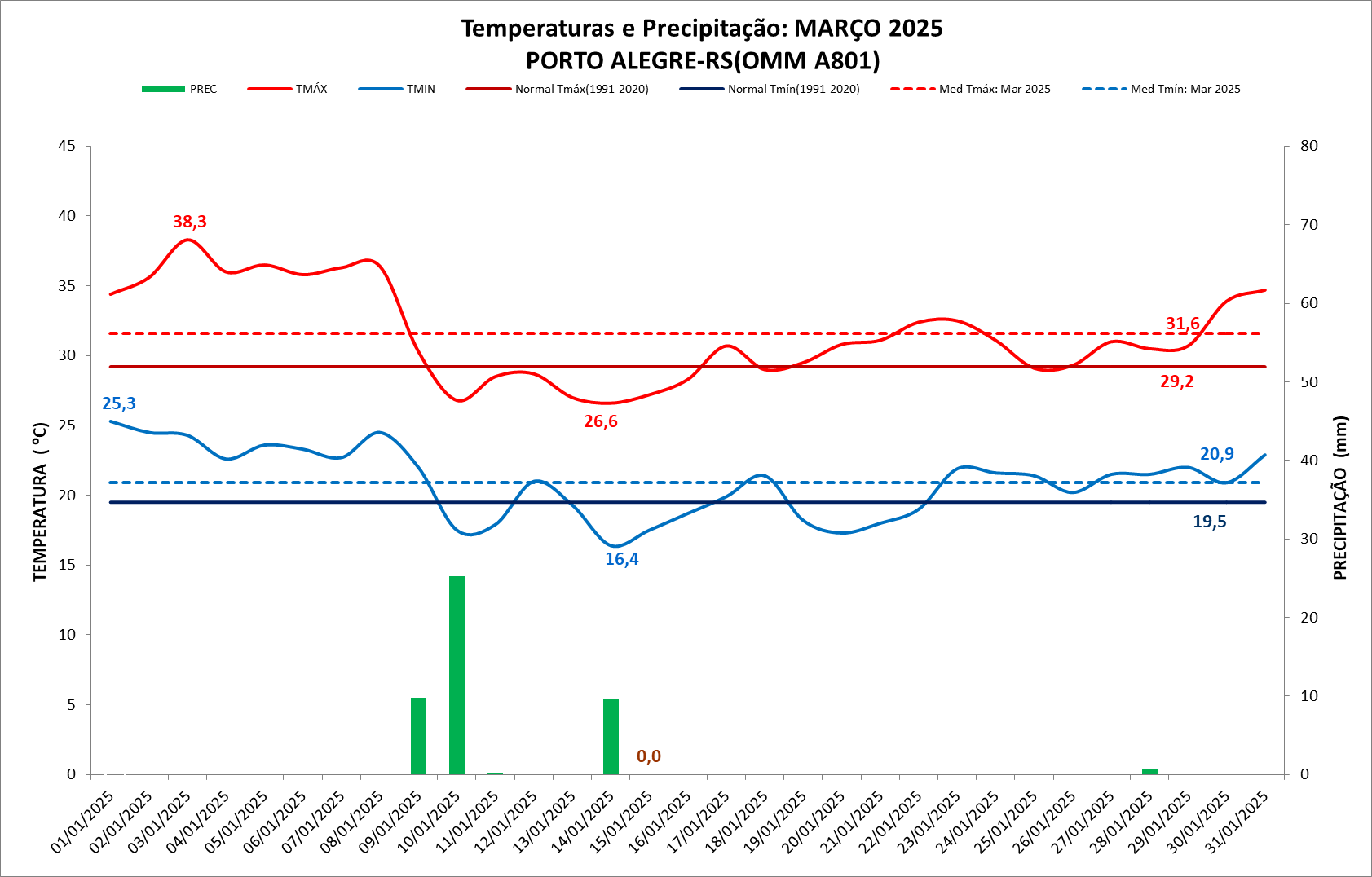 Figura 1: Temperaturas e precipitação do mês de março de 2025 em Porto Alegre – RS e Normal Climatológica (1991 a 2020)