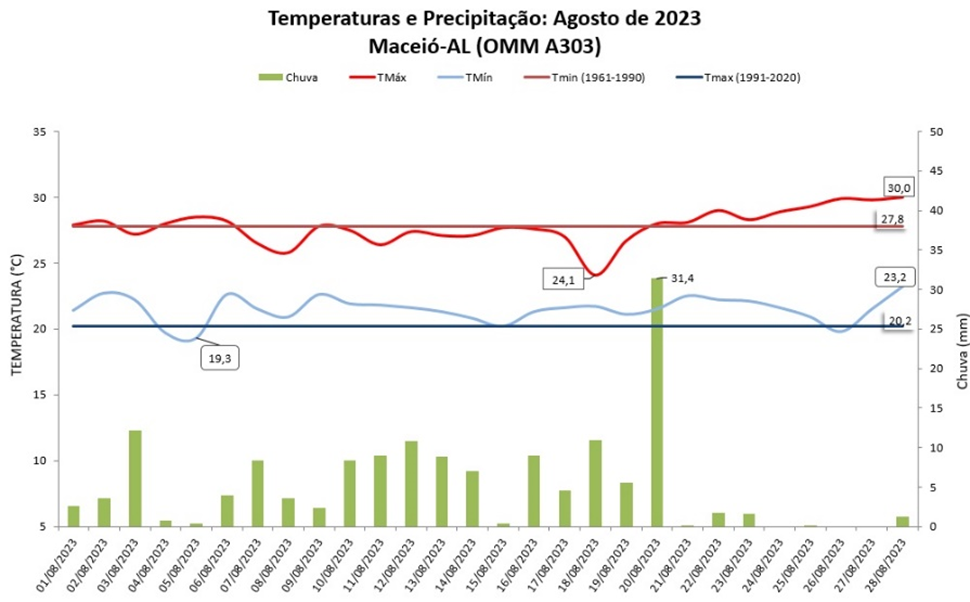 Em agosto, o total de chuva em Maceió (AL) registrado na estação A303 foi de 153,6 milímetros (mm). Esse valor corresponde a 20% abaixo da normal climatológica da estação convencional (1991-2020), que é de 191,5 mm (figura 1).