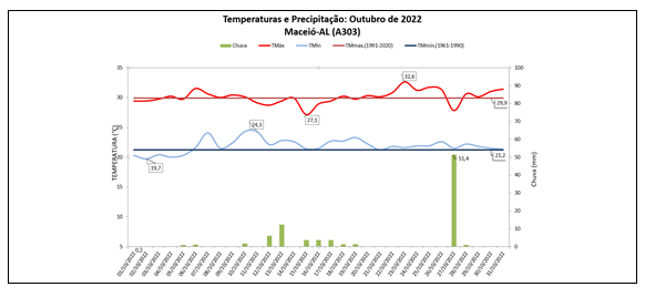 Em outubro deste ano, Maceió (AL) registrou 88,6 milímetros (mm) de chuva, o que corresponde a 26% acima da média histórica (1991-2020), que é de 70,2 mm (figura 1). Ao todo, 12 dias do mês tiveram chuva, sendo que o maior acumulado em um único dia foi de 51,4 mm, observado no dia 27.