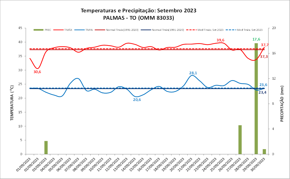 Figura 1: Temperaturas e precipitação (chuva) do mês de setembro de 2023 em Palmas (TO) versus a Normal Climatológica (1991 a 2020).
