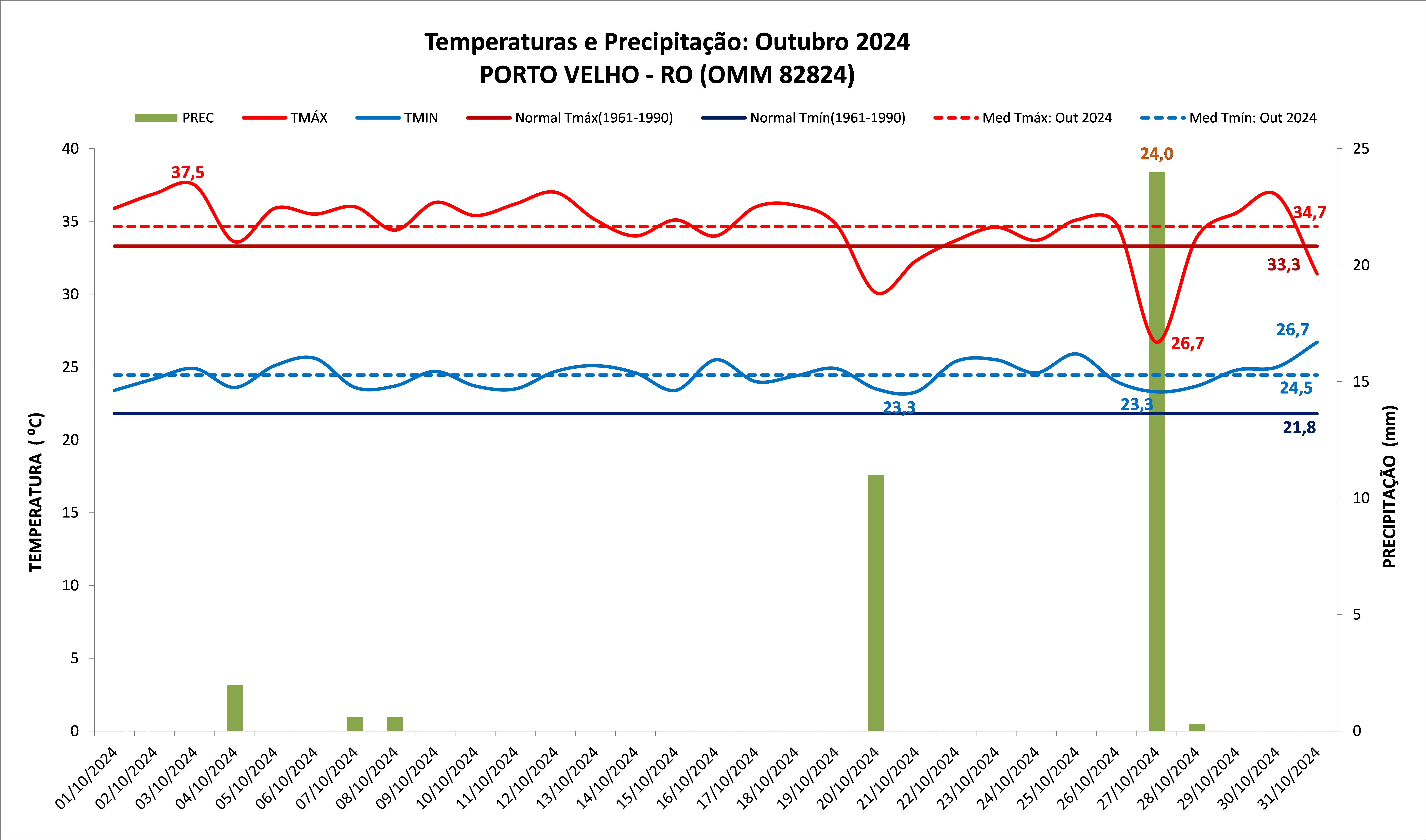 Figura 1: Temperaturas e precipitação do mês de outubro de 2024 em Porto Velho – RO versus a Normal Climatológica (1961 a 1990)