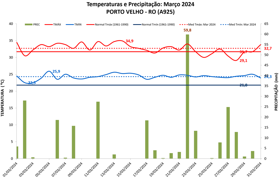 Figura 1: Temperaturas e precipitação (chuva) de março de 2024 em Porto Velho (RO) e Normal Climatológica (1961 a 1990).