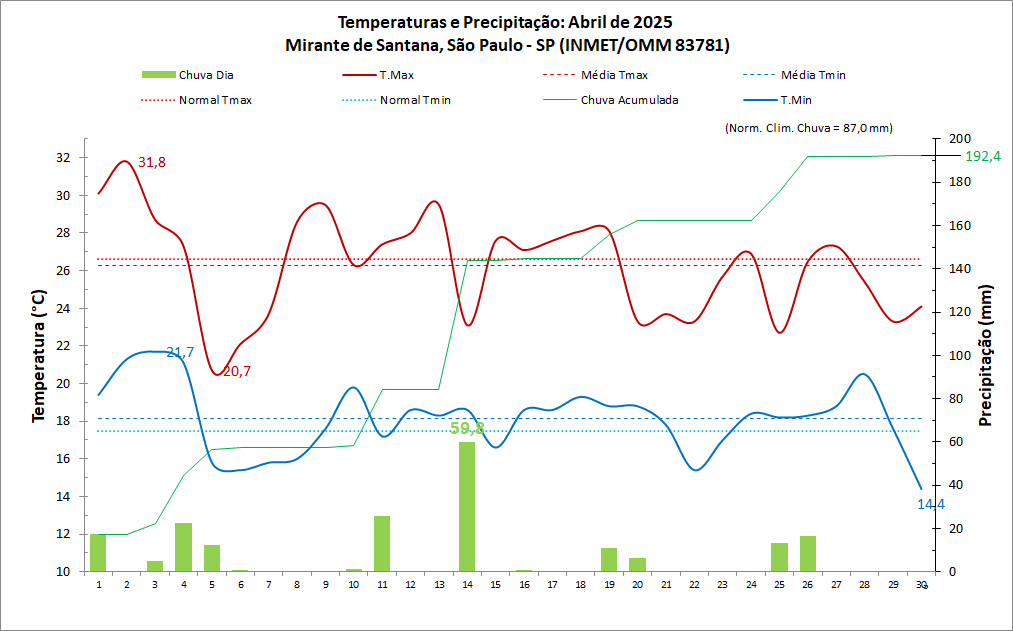 Figura 1: temperaturas e precipitações diárias em abril de 2025 no Mirante de Santana-SP.