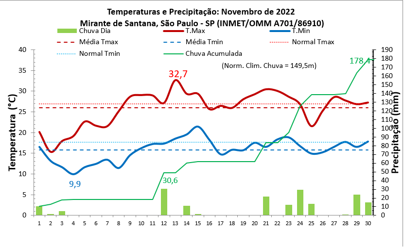 Figura 1: Temperaturas e chuvas diárias, em novembro de 2022, na estação automática do Mirante de Santana (SP). Referência: Média Climatológica Inmet (2006 a 2021).