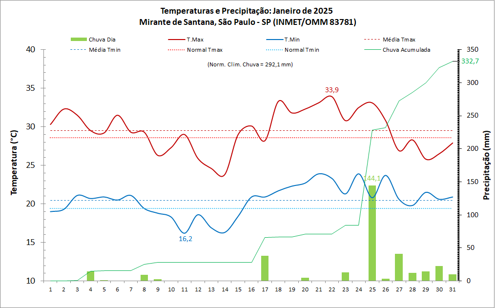 Figura 1: temperaturas e precipitações diárias em janeiro de 2025 no Mirante de Santana-SP.