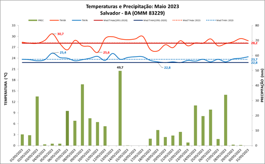 Figura 1: Gráfico com temperaturas e precipitação (chuva) do mês de maio em Salvador (BA). Normal climatológica (1991 a 2020).