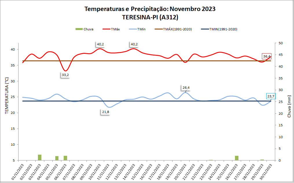 Ao todo, Teresina teve quatro dias com chuva (acima de 1,0 mm) em novembro/2023, sendo que o maior volume acumulado em 24h ocorreu no dia 03/11, com 2,4 mm. Em novembro de 2022, a cidade teve oito dias com chuva e registrou 122,2 mm no mês.