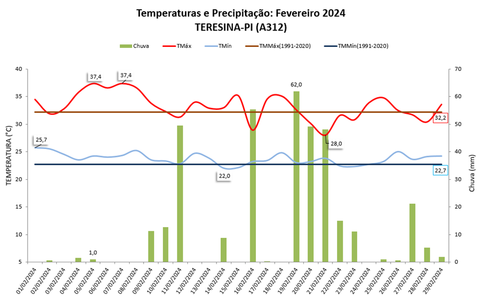 Balanço: Teresina (PI) teve chuva e temperaturas acima da média em fevereiro/2024