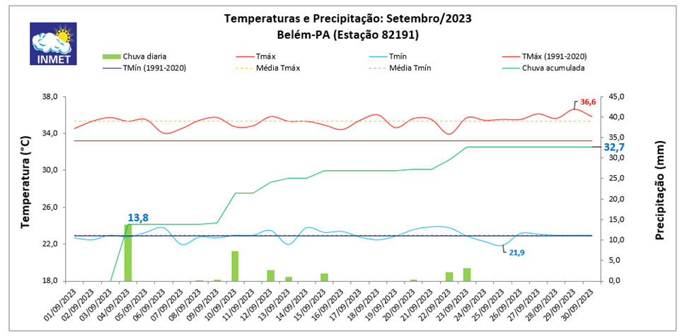 Na capital do Pará, a média da temperatura mínima no mês de setembro foi de 23,0°C. Já a média da temperatura máxima foi de 35,3°C.