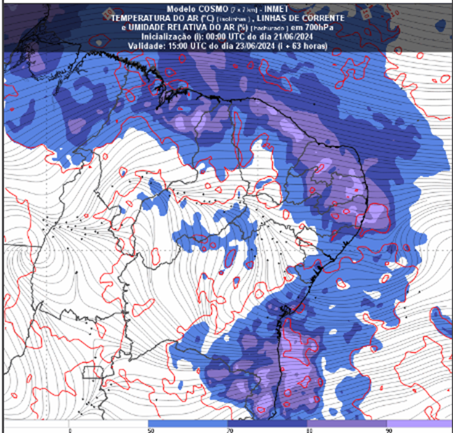 Figura 1: Intensificação da umidade em baixos níveis da atmosfera, ilustrados pelo campo de linhas de corrente e umidade em 700 hPa às 15 UTC do dia 23/06/2024 (12 horas pelo horário de Brasília) pelo modelo numérico Cosmo 7 km, atualizado em 21/06/2024.