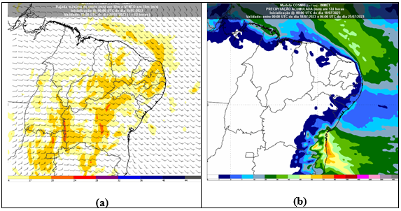 Figura 1: Modelo Cosmo 7 km atualizado às 00 UTC do dia 18/07/2023 e previsões de (a) direção e intensidade do vento (rajadas) para o dia 20/07/2023, às 15 UTC (12h do dia 20/07/2023 - horário de Brasília) e (b) acumulado de chuva no período de 18/07/2023, às 00 UTC (21h do dia 17/07 – horário de Brasília), a 25/07, às 00 UTC (21h do dia 24/07 – horário de Brasília).